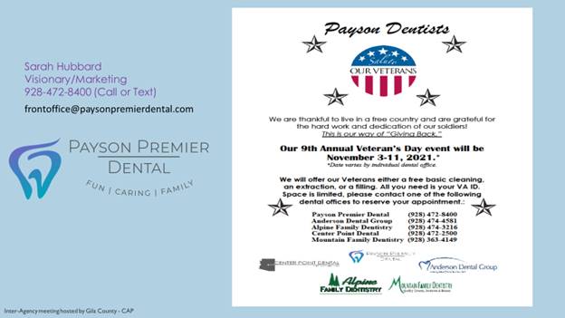 2. Payson Dentist event November 3-11. The date depends on when you can schedule the appointment with the dental office. There are several participating in this event, so see the flyer for the list of numbers to call and schedule.