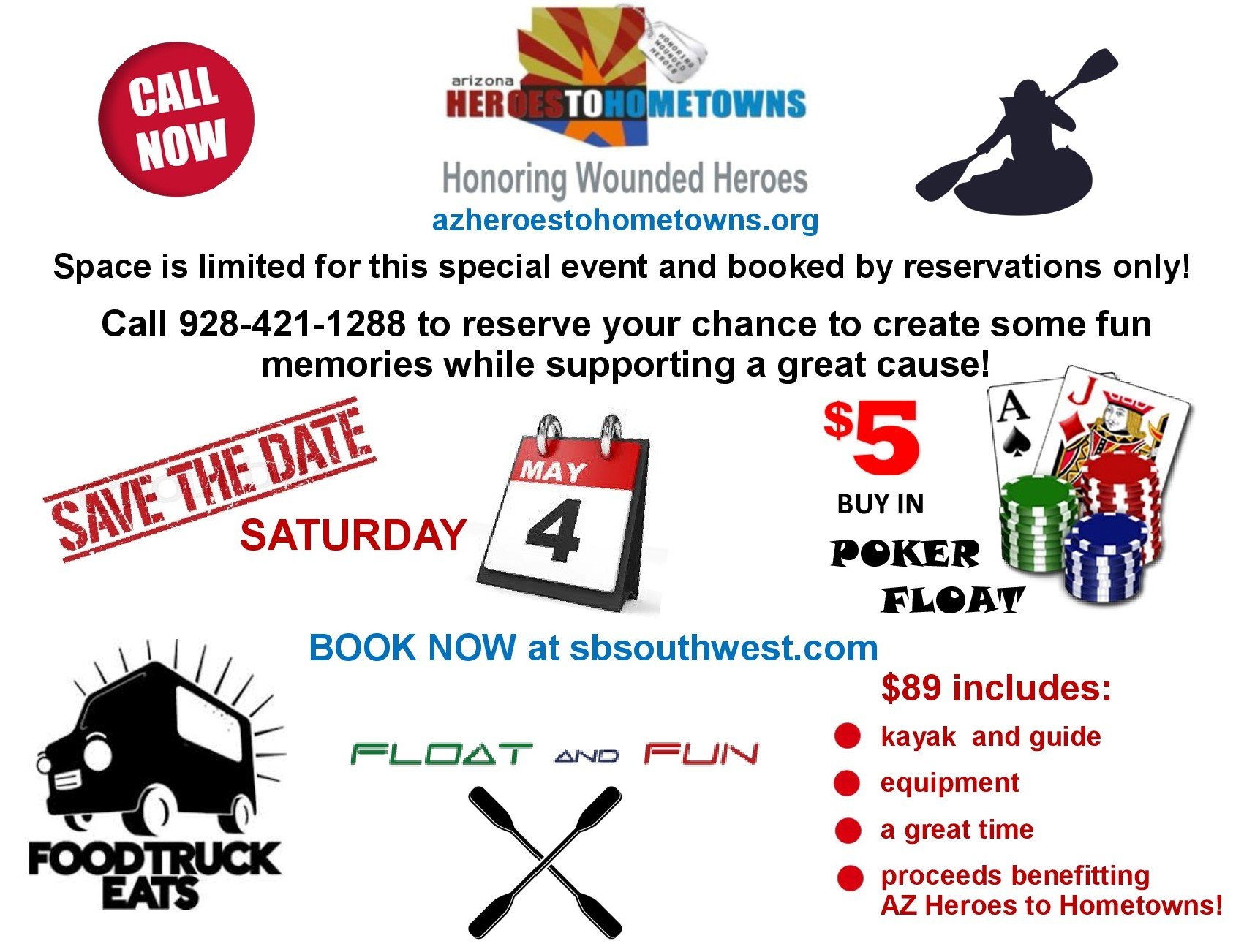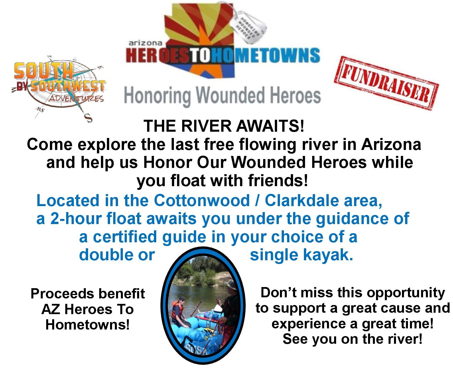 Come explore the last free flowing river in Arizona and help us Honor Our Wounded Heroes while you float with friends! Located in the Cottonwood / Clarkdale area, a 2-hour float awaits you under the guidance of a certified guide in your choice of a double or single kayak. Proceeds benefit AZ Heroes to Hometowns.